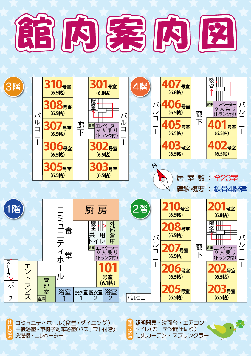 ◆共有設備:コミュニティホール・食堂(ダイニング)・洗濯機・エレベーター・車椅子対応浴室(バスリフト付き)・一般浴室