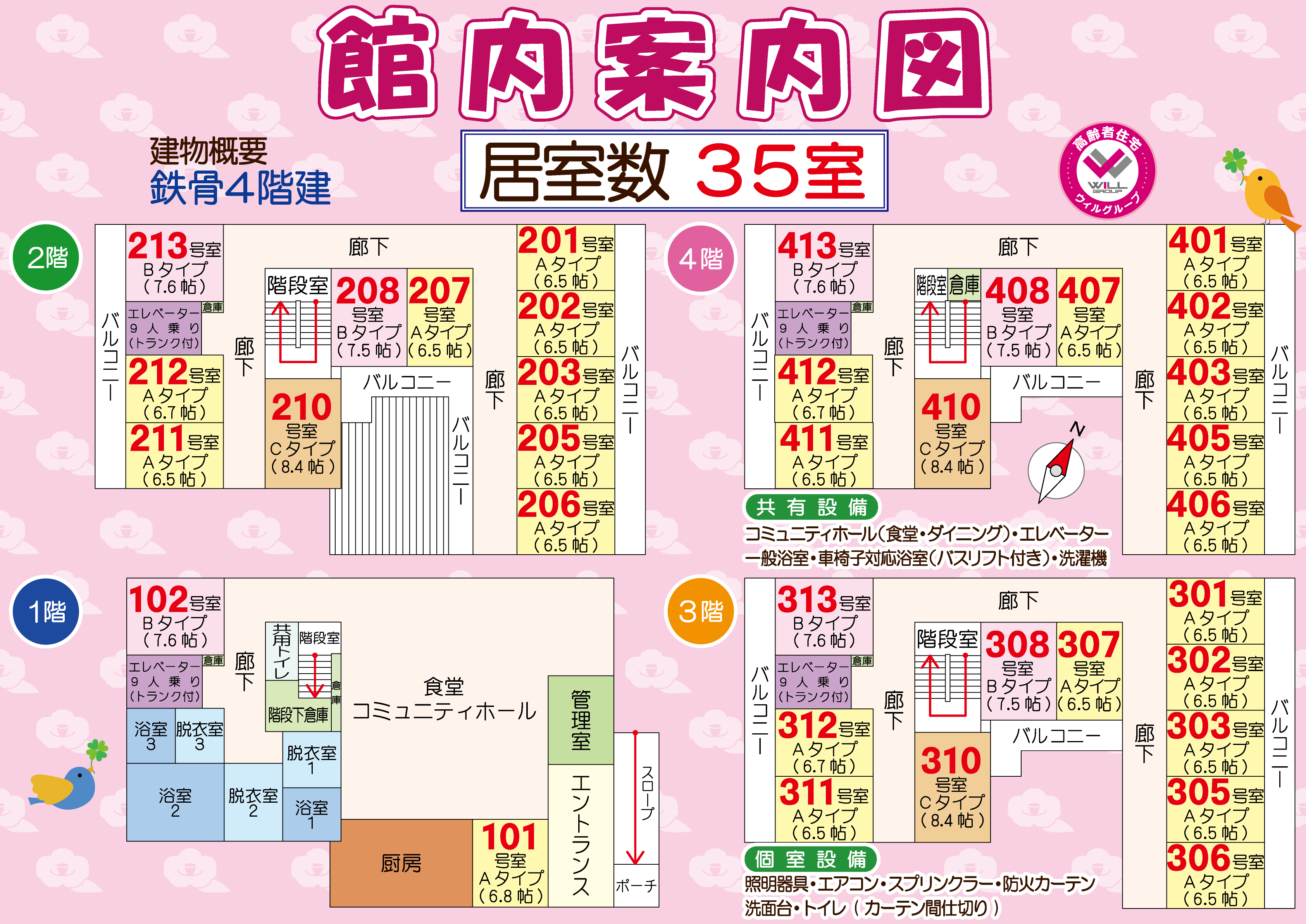 ◆共有設備:コミュニティホール・食堂(ダイニング)・洗濯機・エレベーター・車椅子対応浴室(バスリフト付き)・一般浴室