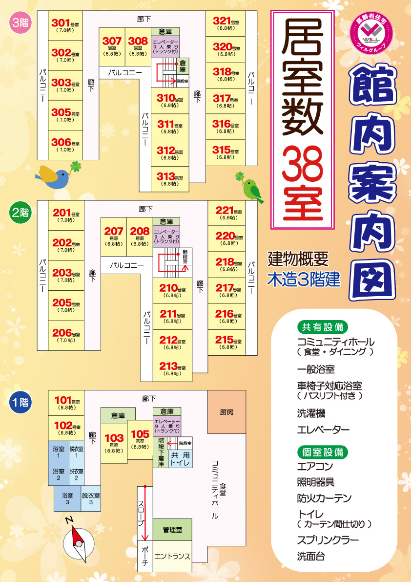 ◆共有設備:コミュニティホール(食堂・ダイニング)・一般浴室・車椅子対応浴室(バスリフト付き)・洗濯機・エレベーター