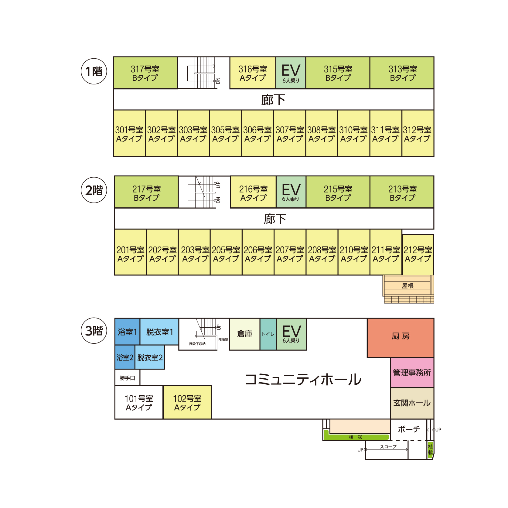 ・共有設備:コミュニティーホール・食堂(ダイニング)・洗濯機・カラオケ・介護バス(ユニットバス)・エレベーター(トランク付き・9人乗り)
