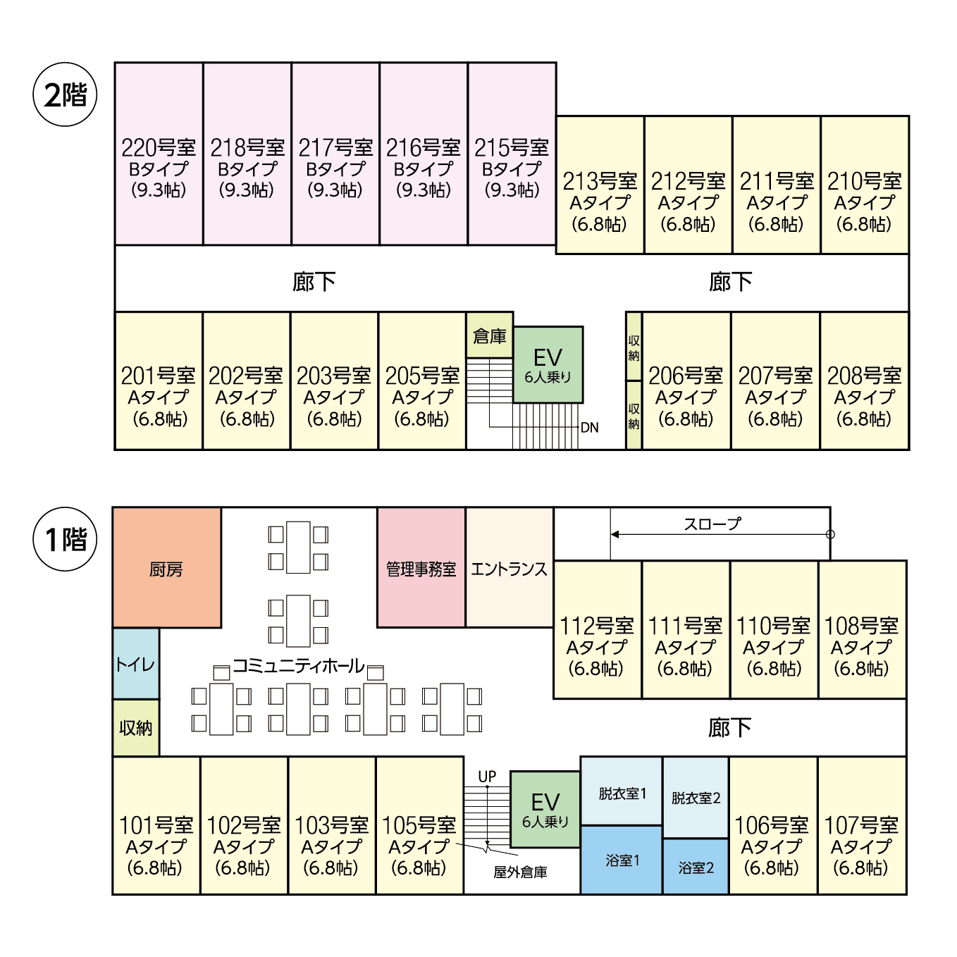 ・共有設備:コミュニティーホール・食堂(ダイニング)・介護バス(車椅子対応)・浴室(ユニットバス)・洗濯機・カラオケ・エレベーター