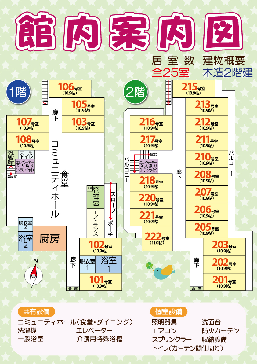 ◆共有設備:コミュニティホール・食堂(ダイニング)・洗濯機・エレベーター・車椅子対応浴室(バスリフト付き)・一般浴室・介護用特殊浴槽