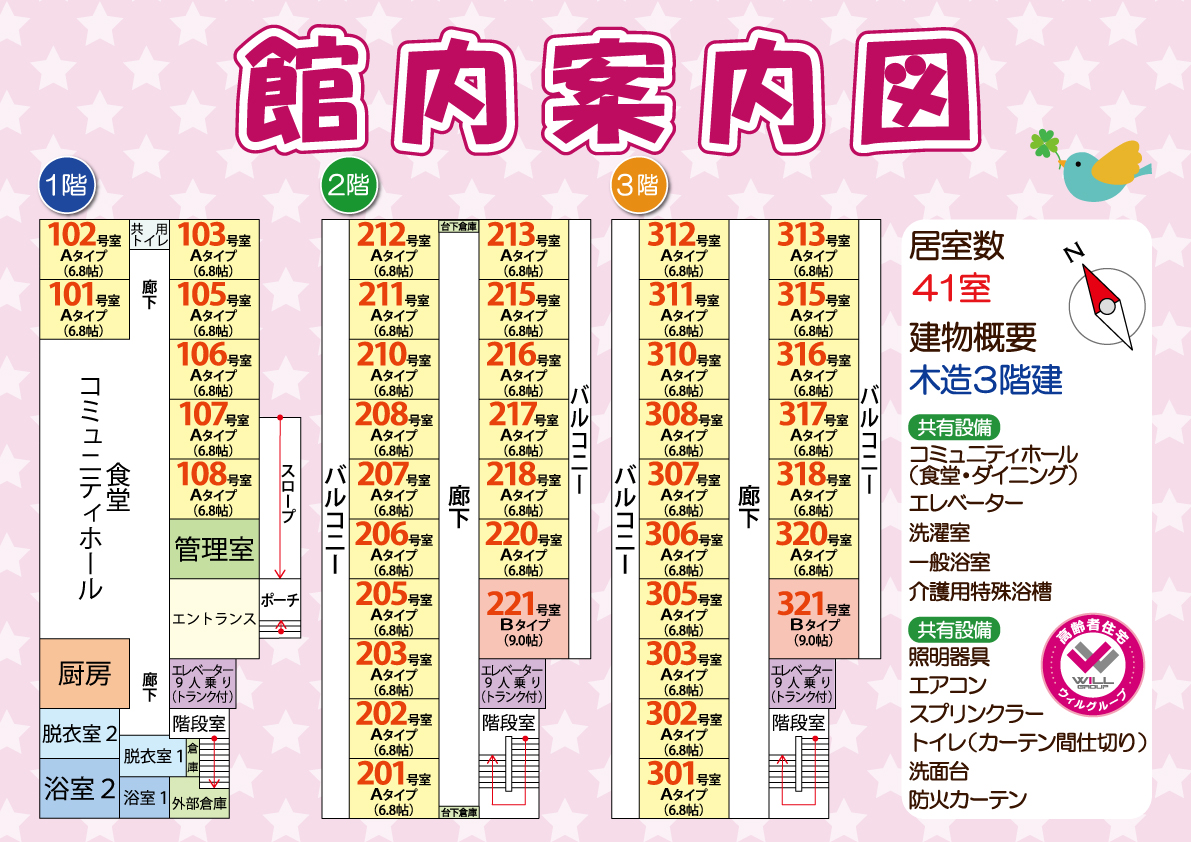 ◆共有設備:コミュニティホール・食堂(ダイニング)・洗濯機・エレベーター・車椅子対応浴室(バスリフト付き)・一般浴室・介護用特殊浴槽