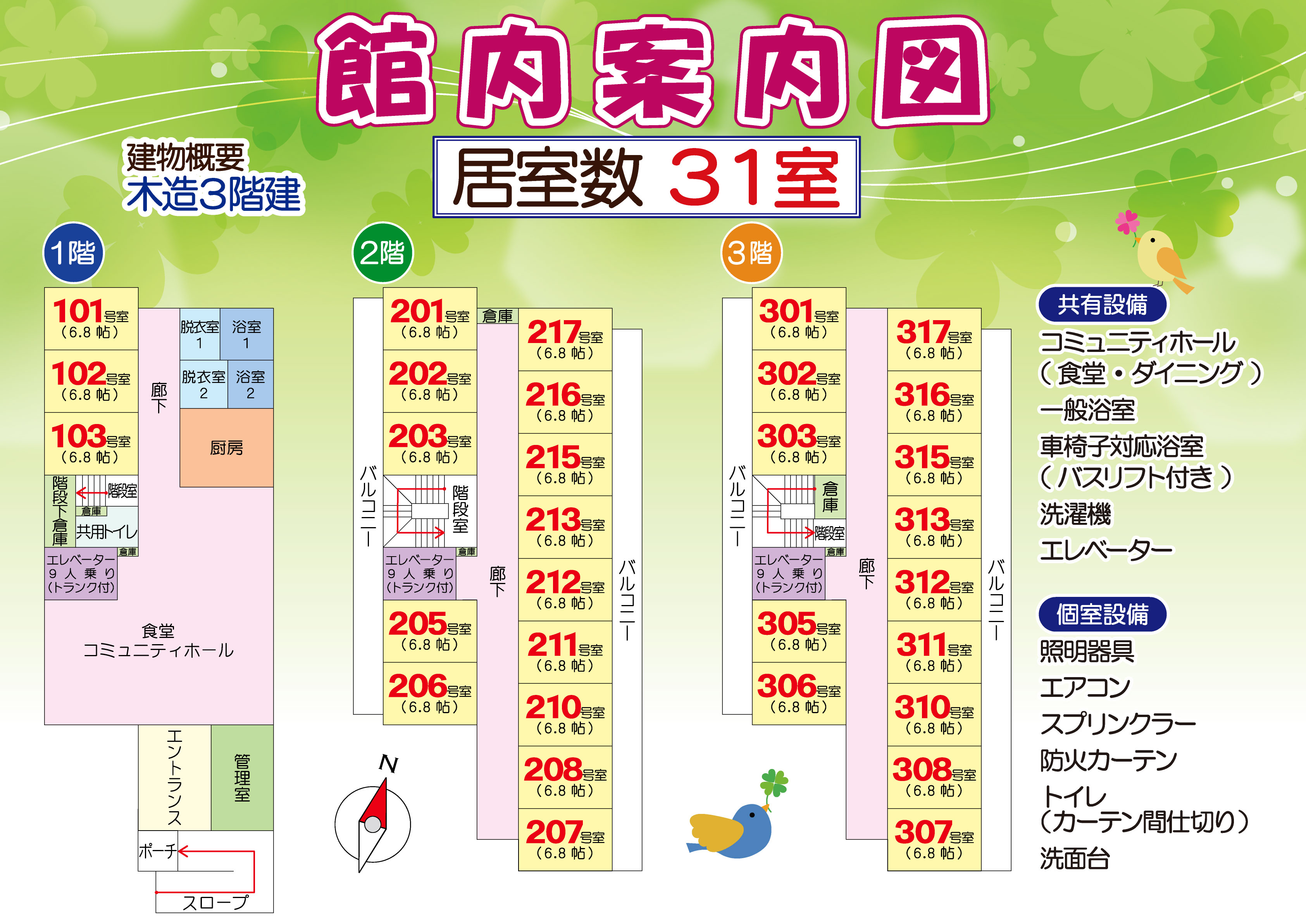 ◆共有設備:コミュニティホール・食堂(ダイニング)・洗濯機・エレベーター・車椅子対応浴室(バスリフト付き)・一般浴室