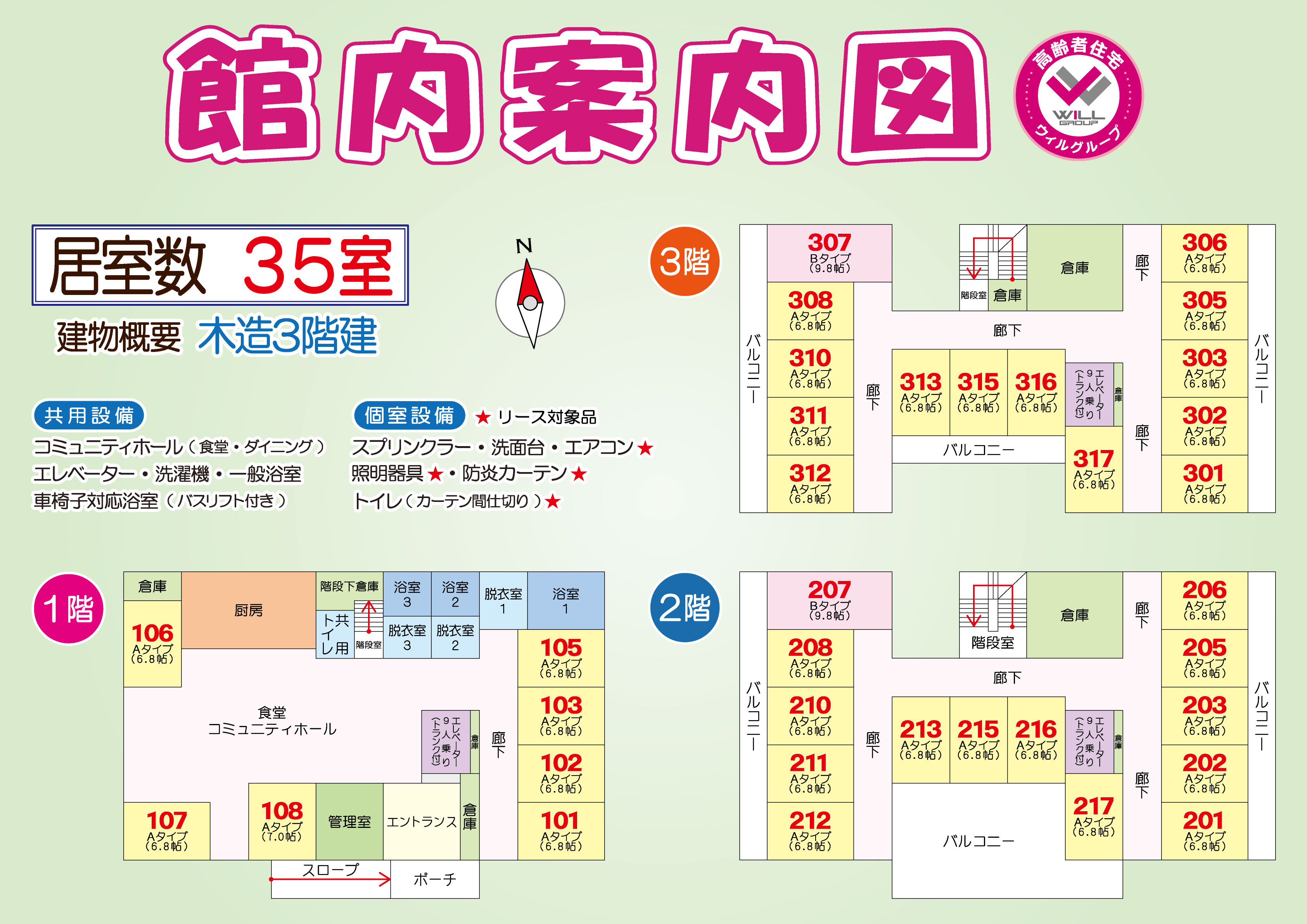 ◆共用設備:コミュニティホール(食堂・ダイニング)・一般浴室・車椅子対応浴室(バスリフト付き)・洗濯機・エレベーター